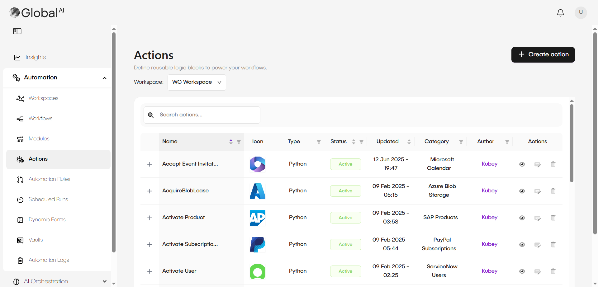 Actions are pre-built integrations that allow you to connect to and automate specific third-party applications and services. The GlobalAI platform includes over 1,400 Actions for common platforms like Salesforce, Jira, and ServiceNow.