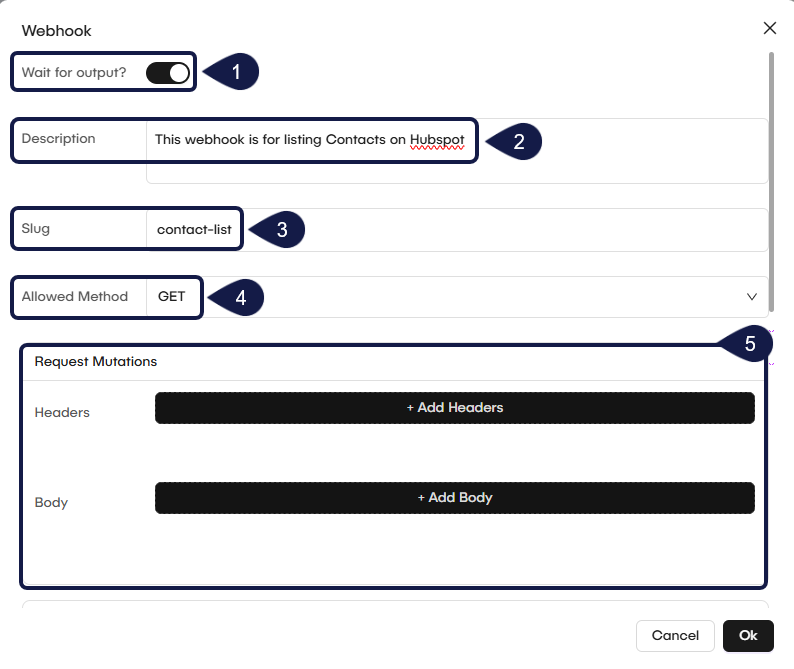 Once you finish applying your configurations, click Ok. Your webhook trigger is now configured. After you add the trigger, GlobalAI generates a Webhook URL. You will use this URL in your external application. You can test it by sending a request to the generated URL.