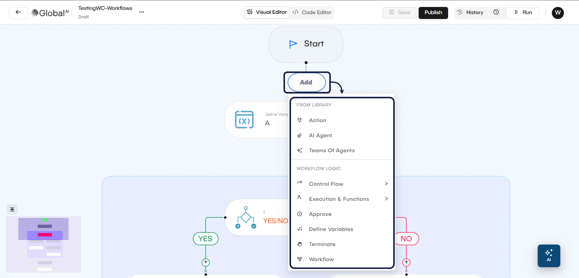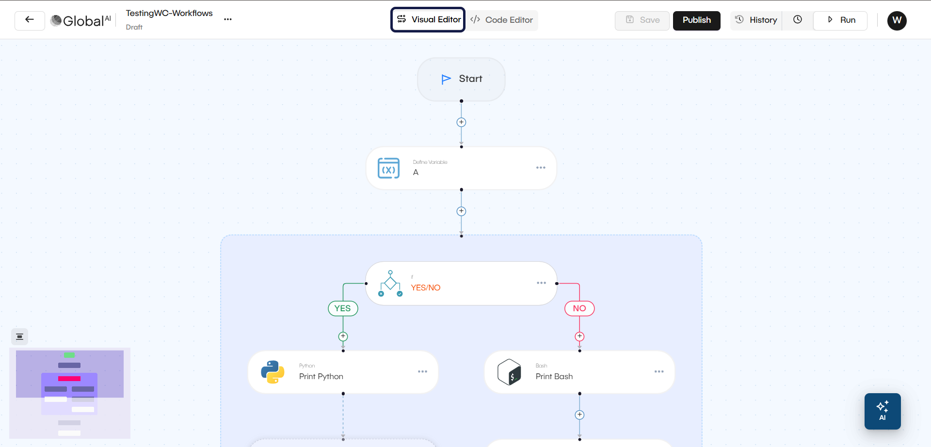 The Workflow editor is the visual canvas where you design and execute automated sequences of tasks. In GlobalAI, every workflow resides within a Workspace, which provides the structured environment and resources needed to orchestrate your automation.