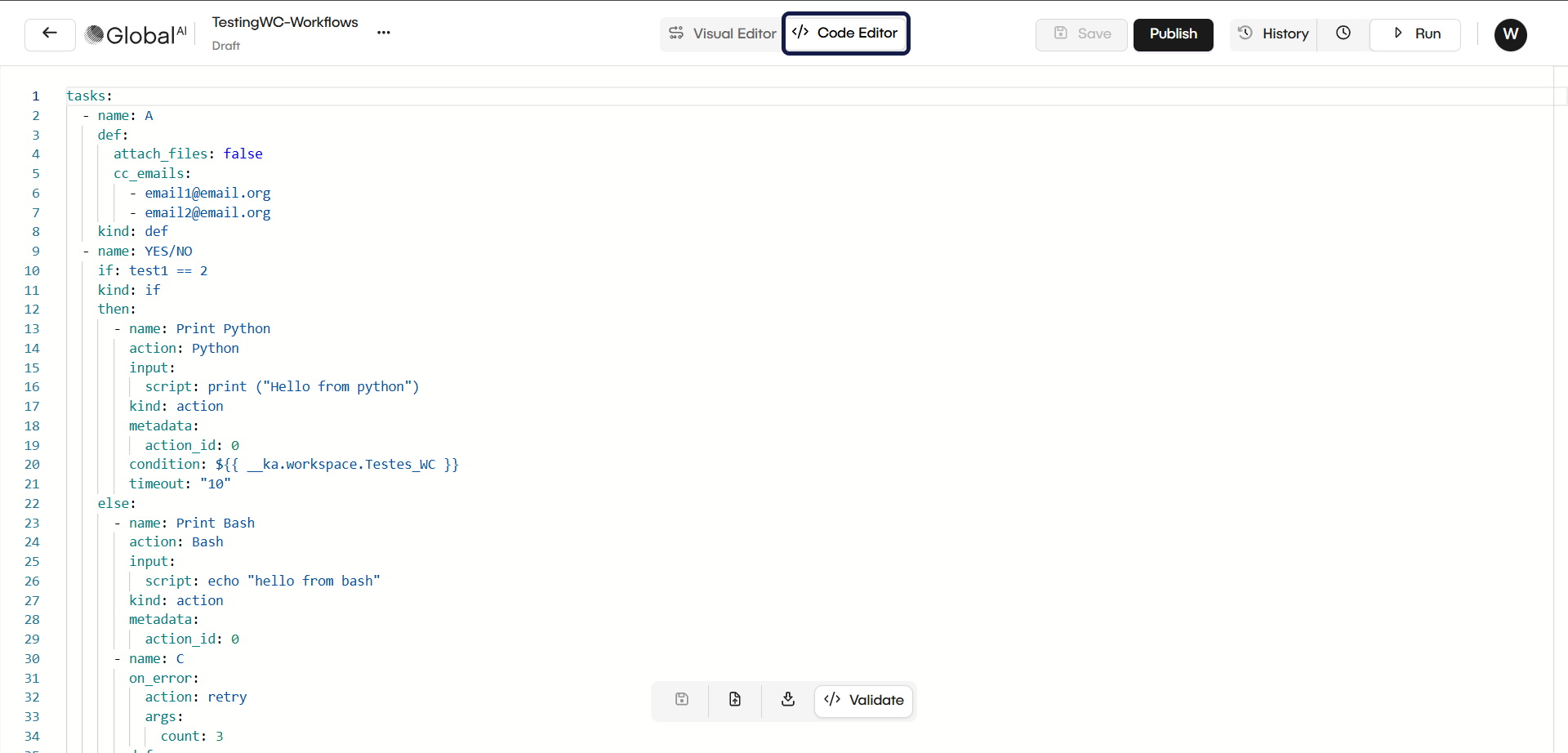• Code editor This view shows the underlying YAML configuration for your workflow. While you can build visually, the Code Editor is helpful for advanced tasks. For example, it makes it easier to copy, paste, or duplicate large sections of your automation to maintain consistency across your Workspace.